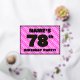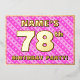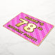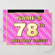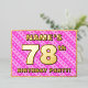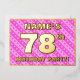 The front of this fun and upbeat seventy-eighth birthday celebration/party foil invitation card design features a customisable name, a large number “78th”, the message “BIRTHDAY PARTY!”, and a border. The background of the front has a joyful light pink and dark pink striped pattern, with heart shapes. The back features personalised details about the event, such as the date, time, location/venue, and any other relevant information. Personalised invitations like these might be a fun way to invite attendees/guests to a birthday gathering/party being held to honour somebody’s 78th birthday. [~Z0000603]