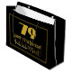 This vintage style 1920s/1930s look inspired birthday giftbag design features a large art deco style inspired number "79", the message "Happy 79th Birthday,", a personalised name, and a border pattern consisting of thin lines. The background is coloured black. A birthday themed gift bag like this might be used to wrap a gift or present being given to somebody who is celebrating their seventy ninth birthday. [~Z0000501]