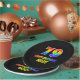 This colourful, fun, and cheerful birthday themed paper plate design features a large number "79" and the message "HAPPY BIRTHDAY,", both having a rainbow spectrum gradient inspired pattern colouring, along with a bold yellow personalised name. The background is coloured black. Fun, personalised birthday themed paper plates like this might be used at somebody’s 79th birthday party. [~Z0000488]