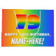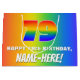 This vibrant and exciting birthday-themed giftbag design features a large number “79” with a colourful rainbow spectrum inspired gradient pattern, along with the message “HAPPY 79th BIRTHDAY,”, and an editable recipient name. The background also features a joyful multicolored rainbow spectrum inspired gradient pattern. Gift bags like this might be used when wrapping gifts being given to somebody in celebration of their 79th birthday. [~Z0000577]