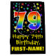 This vibrant, exciting, and fun birthday-themed gift bag design features a large number "79" with a rainbow spectrum gradient style pattern, along with the message "Happy 79th Birthday,", and an editable recipient name. It also has a colourful background pattern featuring variously-sized star shapes. A fun gift bag like this might be used when wrapping presents being given to somebody in celebration of their seventy ninth birthday. [~Z0000510]