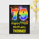 The front of this colorful, exciting, and fun birthday greeting card design features a large number "79" having a rainbow spectrum gradient inspired pattern. It also features the message "Happy 79th Birthday,", and a custom recipient name. The front additionally features a colorful bursting celebratory fireworks inspired background pattern. The inside features a customized birthday greeting message, or could perhaps be cleared and left blank if a message is to be written by hand instead. A personalized birthday card like this might be a fun way to celebrate somebody’s seventy ninth birthday. [~Z0000442]