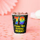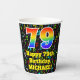 This joyful and cheerful music-themed birthday paper cup design features a large number “79” with a rainbow spectrum gradient inspired pattern, along with the message “Happy 79th Birthday,”, and an editable name. The background features an exciting and colourful pattern of various music notes and symbols having a variety of colours and sizes. Vibrant, colourful paper cups like this might be fun to use at a birthday celebration/party being held to honour somebody’s seventy ninth birthday. [~Z0000541]
