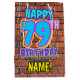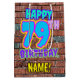 The front of this fun birthday themed gift bag design features the message “HAPPY 79TH BIRTHDAY,” having a colourful, vibrant, graffiti-inspired look, plus an editable recipient name. The background features a pattern inspired by the look of a brick wall. A gift bag like this might be used when giving a gift or present in honour of somebody’s 79th birthday. [~Z0000536]