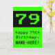 This fun and nerdy birthday themed greeting card design features a large green vintage computer gaming style number "79" on the front. It also features the birthday greeting message "Happy 79th Birthday,", and a name that can be customized. The inside features a customized birthday greeting message, or could perhaps be cleared and left blank if a message is to be written by hand instead. A fun and geeky birthday greeting card like this might be used to acknowledge the seventy ninth birthday of a computer programmer, an engineer, or somebody who enjoys video games. [~Z0000430]