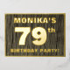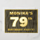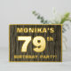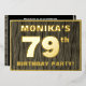 The front of this bold seventy-ninth birthday celebration/party foil invitation card features an editable name, a large number “79th”, the message “BIRTHDAY PARTY!”, and a border, all in foil. The background of the front features a rustic, yet elegant, faux wood grain look inspired pattern. The back features personalised details about the event, such as the date, time, venue, and any other important information. Customisable invitations like these might be used to invite attendees to a birthday gathering/party being held in celebration of somebody’s 79th birthday. [~Z0000598]