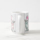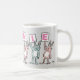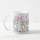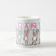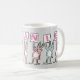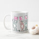 Fun Rabbit Design Mug for someone with a 7 Letter Name. Fun white Mug with illustration of Rabbits in pink and blue. Example name is Melanie. Cute baby rabbits. The rabbits are holding up cards to spell out the name.