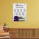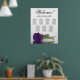 The wedding seating chart includes seven tables and showcases a stunning and romantic aesthetic. A solitary long-stemmed deep royal purple rose rests horizontally, casting a reflection in a pool of water. The chart's heading is elegantly written in script calligraphy, reading "Welcome! Please find your table." The bottom section provides room for the couple's names and the wedding date. With ten seats per table, this chart accommodates 70 guests and serves as a delightful and practical tool for guiding guests to their seats at the reception.