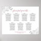 This beautiful wedding seating chart includes seating for 7 tables or 70 guests with 10 seats per table. The chic sophisticated design is simple yet elegant with dark grey and dusty rose or mauve pink text on a white background. The title reads: "please find your table" in a lacy script calligraphy and the corners are decorated with silver faux foil frills in a delicate floral pattern. Wonderful way to help your guests find their tables at your reception while adding a touch of style.