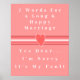 Featuring a delightful design our Funny Wedding Poster is sure to capture everyone's attention. The poster showcases seven words of humourous advice for a long and happy marriage: "Yes Dear, I'm Sorry, It's My Fault." These words serve as a lighthearted reminder of the importance of communication, understanding, and a good sense of humour in a relationship.