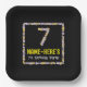 This fun, botany-inspired birthday paper plate design features a customisable name, and the message “7th Birthday Party!”. The border and large number “7” feature flower icons. Paper plates like these might be used at a birthday party for somebody who is celebrating their seventh birthday, or some other 7th anniversary or event. [~Z0000655]