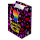 This fun and happy birthday-themed giftbag design features a large number “7” with a rainbow spectrum gradient inspired pattern, along with the message “Happy 7th Birthday,”, and a custom name. The background features a pattern of purple, pink, and red heart shapes of various sizes. A gift-bag like this might be used when giving a gift or present in honour of somebody’s seventh birthday. [~Z0000551]
