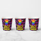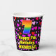 This joyful and fun birthday themed paper cup design features a large number “7” having a rainbow spectrum gradient inspired pattern. It also features the message “Happy 7th Birthday,”, and a personalised name. The background features a pattern of purple, red, and pink heart shapes. Cheerful, fun paper cups like this might be fun to use at a birthday party being held in celebration of somebody’s 7th birthday. [~Z0000548]
