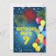A fun 7th birthday party invitation with happy colours, balloons and fireworks. See the whole range of invitations and cards in my store.