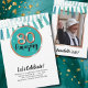 Teal and rose gold eightieth birthday invitation. Front has one photo, teal tassels at the top. Back side has an "80 and Amazing" logo, with party details below.