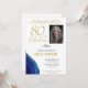 80 and Fabulous Gold Ornament 80th Birthday Photo Invitation. 80 and fabulous text in trendy golden script with photo and name. The invite has a gold ornament and beautiful blue marble. Personalise it with your photo and details, and make elegant surprise birthday party invitation for woman`s birthday party.