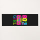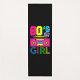 A black yoga mat with a design that reads '80s Girl in bright, neon colours, placed on a light wood floor next to a white-water bottle. The "80" is stylised with the "8" in pink, the "0" in yellow, and the "S" in blue, with a cassette tape graphic incorporated. Below, the word "Girl" is written in green, blue and yellow, with each letter in a different colour. A pink boombox with yellow and blue details is placed between the "80s" and "Girl".