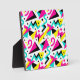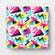 Blast from the past with this electrifying 80s Memphis-style pattern that screams bold fun and unapologetic energy. Vibrant hot pink, electric cyan, sunny yellow, and jet black triangles, squiggles, zigzags, dots, and abstract shapes collide in chaotic harmony on a crisp white background, capturing the iconic postmodern playfulness of the era.