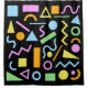 1980s style pattern in colourful shapes of green, yellow, blue and yellow on a black background.
