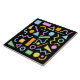1980s style pattern in colourful shapes of green, yellow, blue and yellow on a black background.