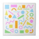 1980s style design in colourful shapes of green, yellow, blue and yellow on a white background.