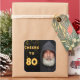 A trendy 80th birthday party sticker. With the text: Cheers to 80 on front written with faux gold balloon letters. Black background with golden confetti. Template for your photo.