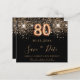 A girly and trendy Save the Date for a 80th birthday party. A black background decorated with faux gold glitter. Templates for a date and name and text. Golden coloured letters. The text: Save the Date is written with a large trendy hand lettered style script.