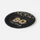 Modern and festive black and gold personalised 80th birthday party paper plates featuring the title 80 YEARS IN THE MAKING, script typography, faux metallic gold balloon numbers, gold streamers and confetti and white lights with your custom text in your choice of background colour (shown in black). ASSISTANCE: For help with design modification or personalisation, colour change, transferring the design to another product or if you would like coordinating items, contact the designer BEFORE ordering via Zazzle Chat or email makeitaboutyoustore@gmail.com.