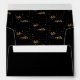 Outside: black background colour. Back: template for a name and address. Golden text. Inside: Black background and faux gold text written with a trendy hand-lettered style script: hello eighty. With golden dots as decor. A simple and trendy envelope for your 80th birthday party invitations, save the dates or thank you cards,