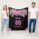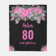 Elegant design for a 80th birthday party with a pink "80 and fabulous" and a scripted name embellished by a feminine watercolor flowers on a black background. Customise age, text, name and background colour.