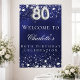 A welcome poster for a 80th birthday party. A navy blue background with elegant faux silver stars. The blue colour is uneven. Personalise and add a name and text. White letters.