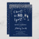 80th Birthday Invitation. Cheers To 80 Years! Elegant design in navy, white and silver. Features champagne glasses, script font and confetti. Perfect for a stylish eightieth birthday party. Personalise with your own details. Can be customised to show any age.