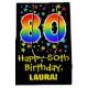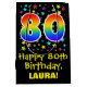 This vibrant, exciting, and fun birthday themed giftbag design features a large number "80" with a rainbow spectrum gradient style pattern, along with the message "Happy 80th Birthday,", and a personalised recipient name. It also has a colourful background pattern featuring star shapes of various sizes. A birthday themed gift-bag like this might be a fun way to wrap a gift or present being given to somebody who is celebrating their eightieth birthday. [~Z0000510]