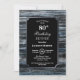 A rustic silver-bordered blue and grey barn wood 80th birthday dinner invitation with the white text highlighted on a black background.