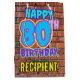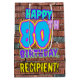 The front of this fun birthday-themed gift bag design features the message “HAPPY 80TH BIRTHDAY,” having a colourful, vibrant, graffiti and urban street art inspired look, plus a personalised recipient name. The background features a pattern inspired by the look of a brick wall. A vibrant birthday themed gift bag like this might be a fun way to wrap a gift or present being given to somebody who is celebrating their eightieth birthday. [~Z0000536]