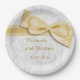 Elegant Birthday Party Paper Plates for women. 80th birthday party plates for birthdays. Beautiful white damask pattern background with a pretty, stylish romantic gold bow and ribbon image. These glamourous, chic, classy custom party paper plates are beautifully sophisticated and is are perfect for all ages. All text is fully customisable to meet your requirements. PLEASE NOTE: All cake picks on Zazzle have flat printed images. Bow and ribbon images purchased from digital-designs-by-elena. If you need any assistance customising your product please contact me through my store and I will be happy to help.