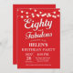 80th Birthday Invitation with String Lights Red Background. Woman Birthday Party. Eighty and Fabulous. Any age. For further customisation, please click the "Customise it" button and use our design tool to modify this template.