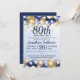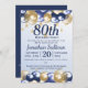 A stylish 80th birthday Party Invitation . Design features navy blue and gold balloons, Gold glittery starts and navy blue text all on a pale blue gradient background. A lovely design inviting your guests to join you for a 80th birthday party celebration. Easy to customize with your own party details.