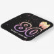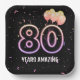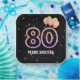 Party balloons and confetti on black background with the neon number 80 for an 80th birthday party.