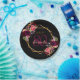 A plate for a 80th birthday party. A chic black background with a faux gold geometric frame. Decorated with dark purple and burgundy flowers, roses and boho style feathers. Templates for a name, age 80 and a date. Date of birth or the date of the party. The name is written with a hand lettered style script, pink coloured letters, age in purple and the date with golden numbers.