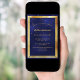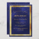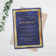 A trendy, modern 80th birthday party invitation card for men, guys, male. A dark blue, navy blue background. The blue colour is uneven. With a faux gold frame and golden confetti sprinkle, golden coloured letters. Templates for your party information.