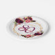A plate for a 80th birthday party. A chic white background with a faux gold geometric frame. Decorated with dark purple and burgundy flowers, roses and boho style feathers. Templates for a name, age 80 and a date. Date of birth or the date of the party. The name is written with a hand lettered style script, pink coloured letters, age in purple and the date with golden numbers.