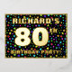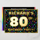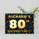 The front of this exciting and eye-catching eightieth birthday party foil invitation card design features a customisable name, a large number “80th”, the message “BIRTHDAY PARTY!”, and a border. The background of the front features a fun, multicolored pattern of stars. The back features personalised details about the event, such as the date, time, place, and any other relevant information. Customisable invitations like these might be a fun way to invite attendees to a birthday gathering being held in celebration of somebody’s 80th birthday. [~Z0000600]