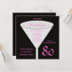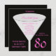 This 80th birthday party invitation was made for women as it features the colours black and hot pink. A glass is the focal point with the name of the birthday honoree and the birthday party details inside. The number 80 appears on the bottom right in hot pink. This 80th birthday party invitation is a very modern design for her. Copyright henishouseofpaper