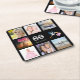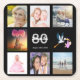 A party coaster for a girly 80th birthday party, celebrating her life with a collage of 8 of your photos. Templates for a name, age 80 and a date. Date of birth or the date of the party. White and grey coloured letters. Elegant black background.