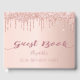 A guest book for a femenine and glamourous 80th birthday party. A faux rose gold background with an elegant faux rose gold glitter drips, paint drip look. The text: The name and the title: Guest Book are written in dark rose gold with a modern hand lettered style script. Tempate for a date and age 80.