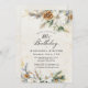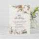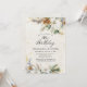 Elegant white flowers are nestled in winter pine greenery and pinecones. The floral design is framed by a soft ivory watercolor wash infused with soft gold flecks. Perfect for a Christmas or winter birthday party.