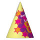 Bright star pattern add your own photo and name party hat. Ideal for a special ladies 80th birthday party celebration. Colourful pink, orange and yellow design. Background colour can also be changed for your own choice currently yellow. Original art and design by Sarah Trett. www.sarahtrett.com for www.mylittleeden.com