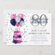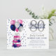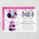 This fabulous 80th birthday invitation featuring a 2-layer pink and silver cake with blue roses and pink, navy blue and silver balloons, the number 80 in silver and shiny blue confetti would be perfect for celebrating your loved one turning 80. It is traditional and classic while being fresh, modern and contemporary. The back is a coordinating pink foil.