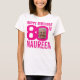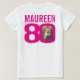 Happy 80th Birthday pink text, custom front, and back photo, and name t-shirt. Fun 80th personalised photo hot pink and white birthday tee design. Personalise this birthday shirt with two photographs of the birthday girl in the middle of the number 0 on the front and back ideal for a past and present photo opportunity. Great idea for adding some fun to a milestone eightieth birthday party or event. Other matching items and colours are available. Exclusive design by Sarah Trett for www.mylittleeden.com